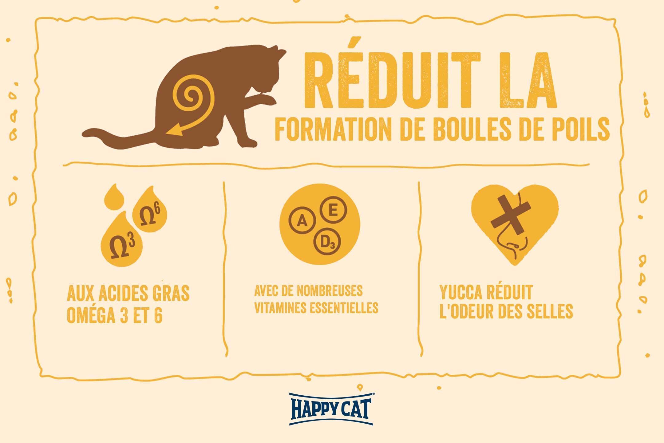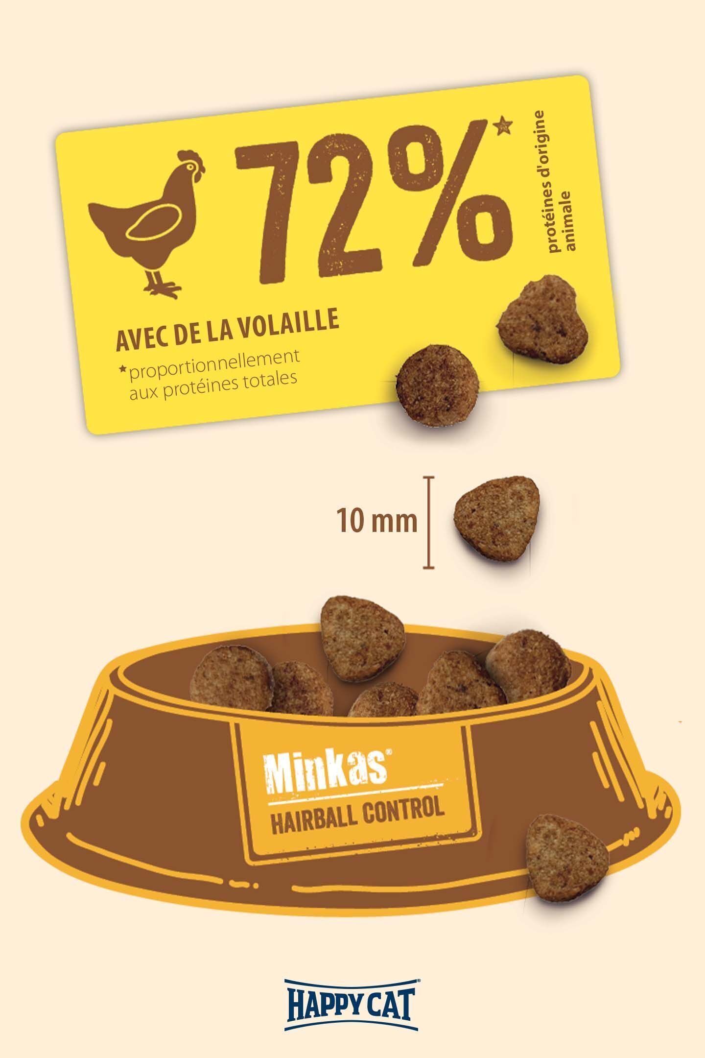 Notre Happy Cat Minkas Hairball Control est conçu avec des fibres brutes spéciales. Celles-ci aident à réduire les boules de poils et contribuent à une excrétion douce via le tractus gastro-intestinal. Cet aliment complet, équilibré est idéal pour les chats adultes et apporte à votre matou tout ce dont il a besoin. Pour une vie de chat longue et saine. Notre recette, qui contient une forte proportion de protéines animales de qualité est 100 % équilibrée et naturelle. Ce délicieux aliment sec est riche en vitamines et minéraux et contribue au bon fonctionnement du système immunitaire. Et naturellement, nos recettes sont exemptes d'arômes artificiels et de conservateurs.