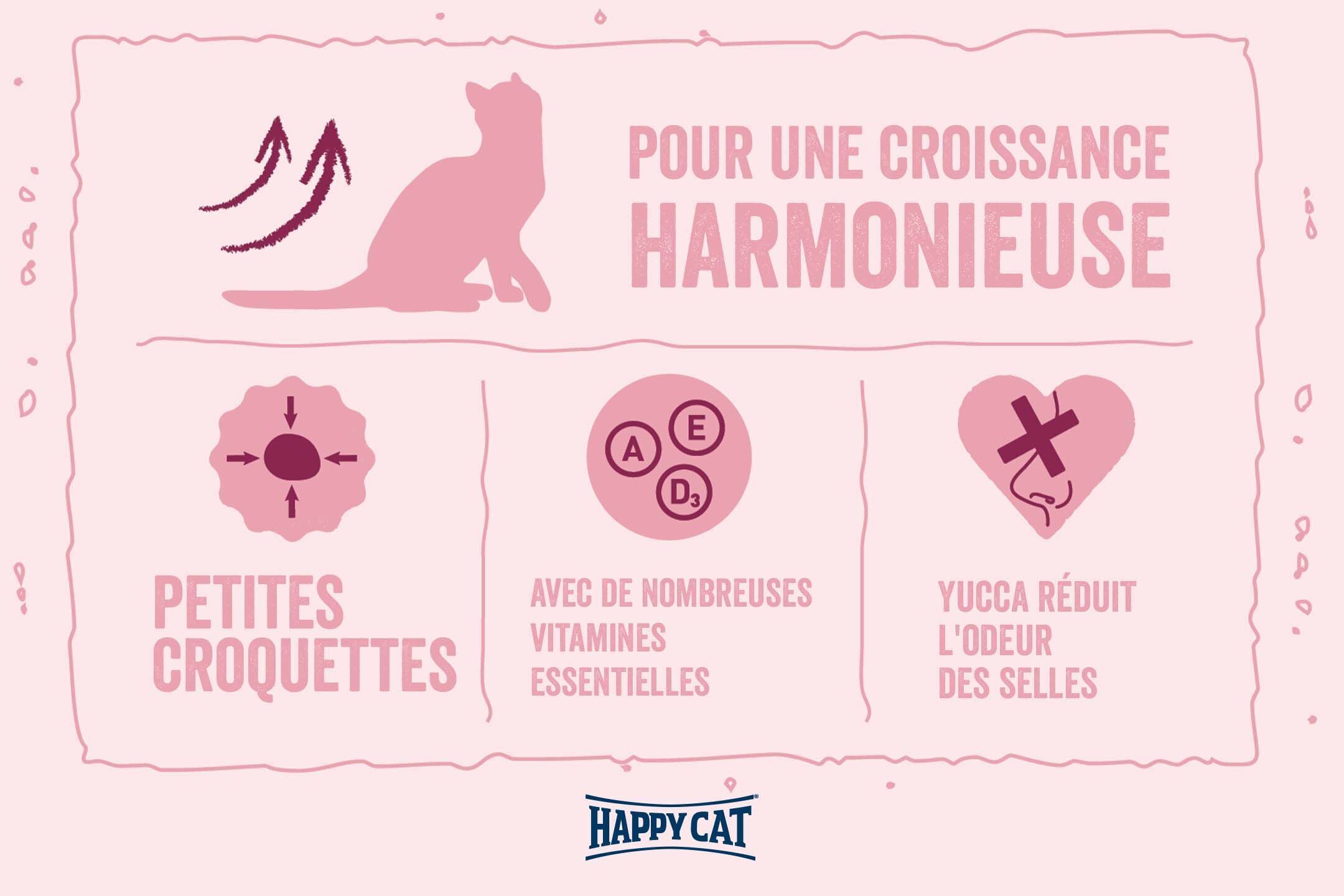Toujours mettre de l'eau fraîche à disposition dans un récipient bien éloigné de la gamelle. En raison des différents besoins individuels de chaque chat, la quantité spécifiée peut être augmentée ou réduite jusqu'à 15 %. Au plus tard à 6 mois, passez à l'alimentation adaptée Happy Cat Junior.