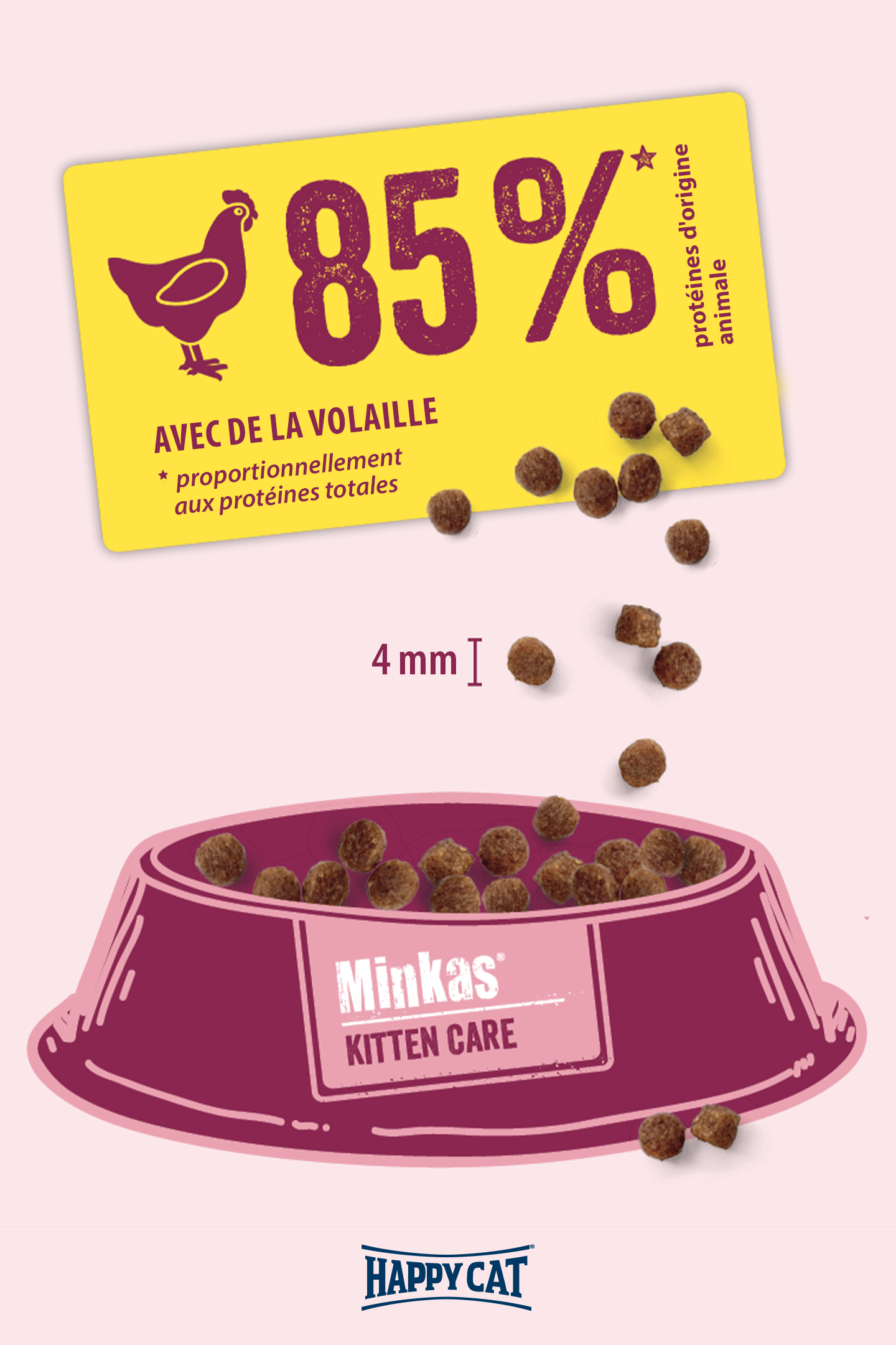 * Selon la préférence de votre chat (taille des croquettes), vous pouvez passer de Minkas Kitten à Minkas Junior à partir du 4e mois.