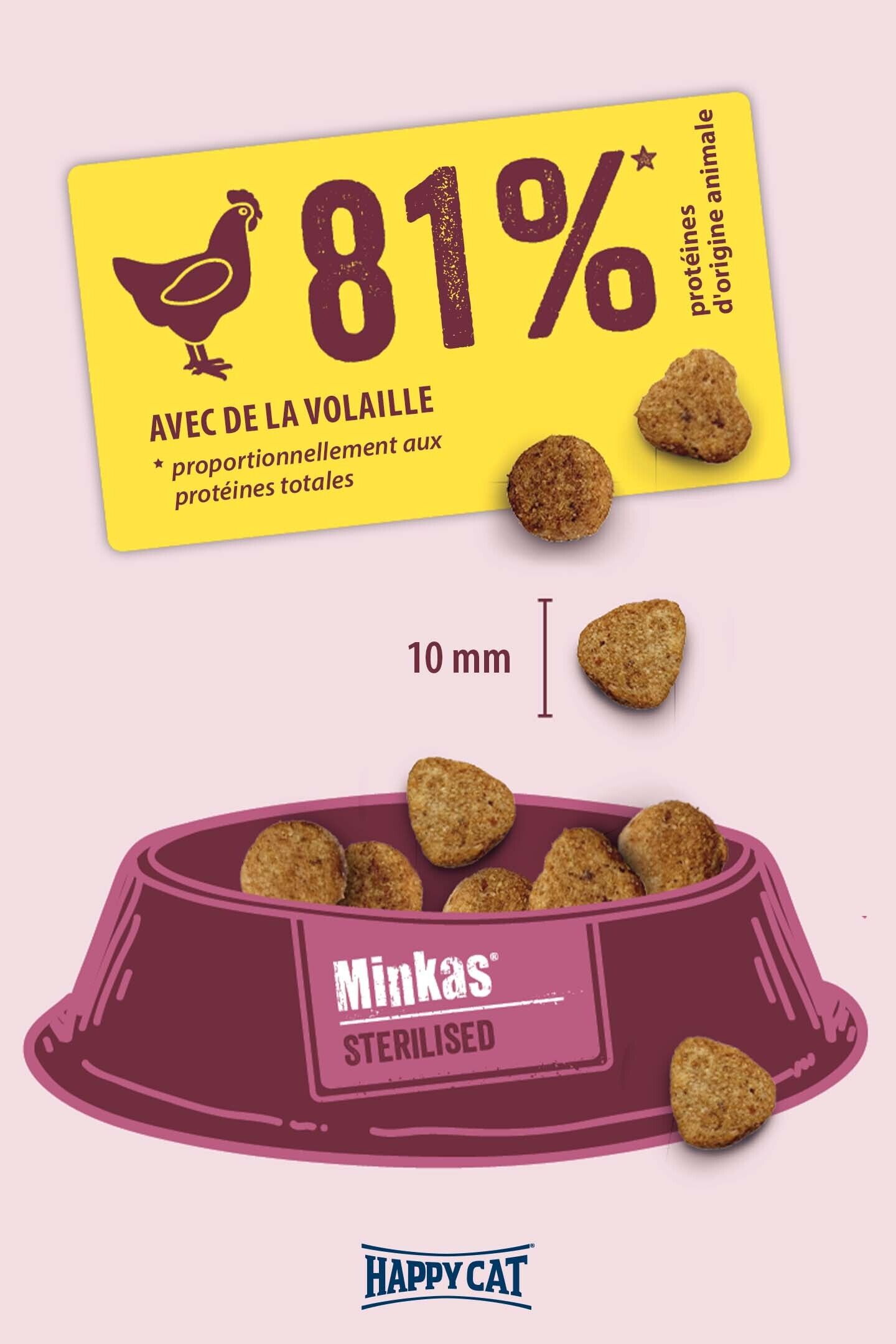 Notre recette riche en protéines animales de haute qualité est 100 % équilibrée et naturelle. Ces croquettes savoureuses contiennent de nombreuses vitamines et minéraux et renforcent le système immunitaire. Bien entendu, nos recettes sont exemptes d'arômes artificiels et de conservateurs. Faites plaisir à votre chat avec notre Minkas Sterilised Volaille au goût riche et intense. Ces croquettes savoureuses sont riches en acides gras oméga-3 et oméga-6, qui favorisent la santé de la peau et du pelage de votre compagnon à quatre pattes. Ainsi, notre Happy Cat Minkas Sterilised Volaille répond à tous les besoins des chats stérilisés.