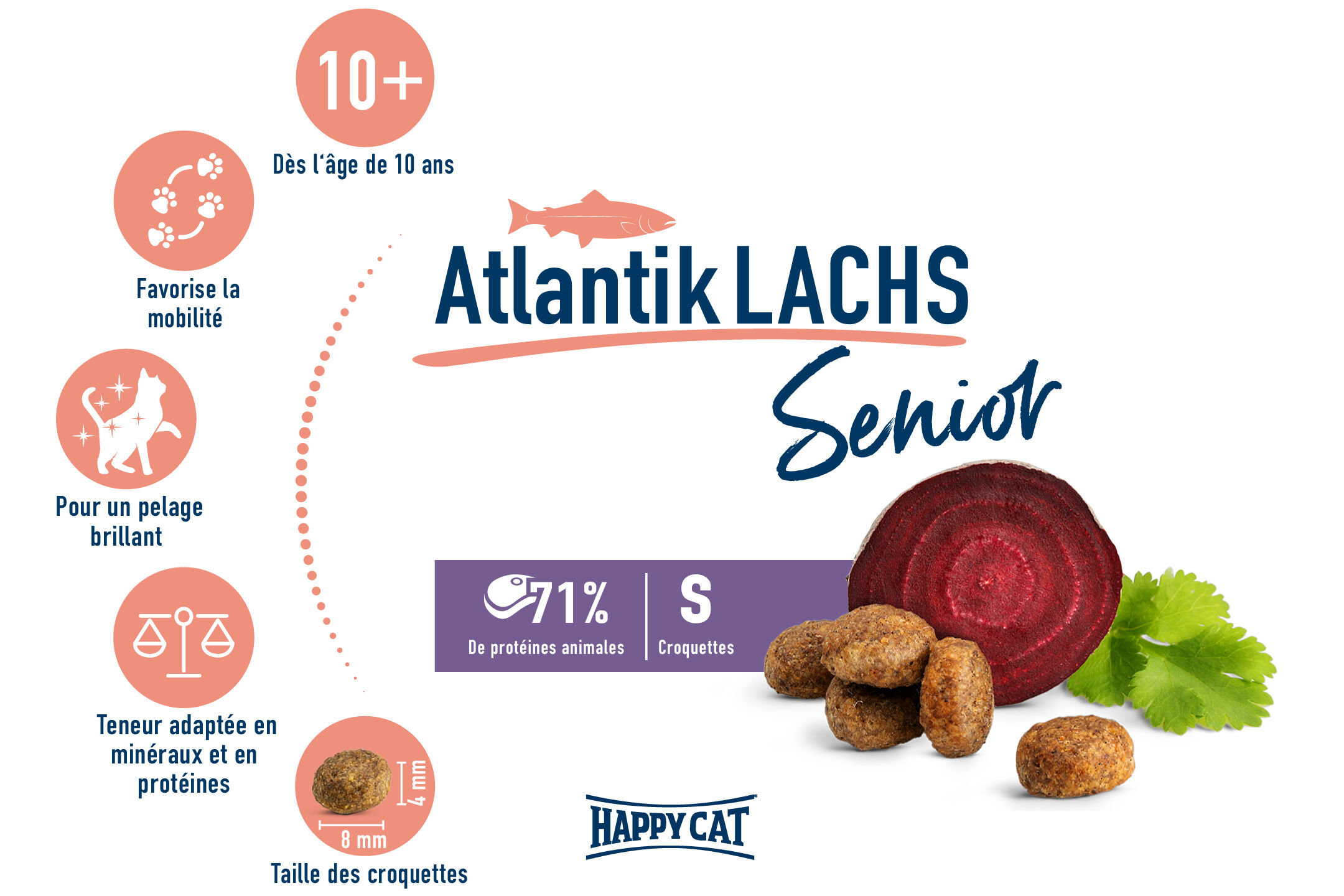 Du saumon savoureux et digeste, associé à de la betterave rouge juteuse et de la coriandre fine, constitue la base de ces croquettes pour chats âgés. Spécialement adaptée aux besoins chats de 10 ans et plus, la teneur en vitamines et en oligo-éléments tels que le fer, le cuivre et le manganèse est plus élevée que dans les aliments secs pour adultes. Les chats âgés ont un besoin accru de ces éléments en raison de leur métabolisme. De plus, la teneur en phosphore, en calcium et en sodium a été adaptée afin de soulager le métabolisme et de ménager les organes de votre chat âgé. Le processus de vieillissement chez les chats peut entraîner des limitations fonctionnelles des organes, qui peuvent par exemple restreindre la fonction rénale. Il est donc important de soulager les organes avec une alimentation adaptée et des minéraux en quantité suffisante.