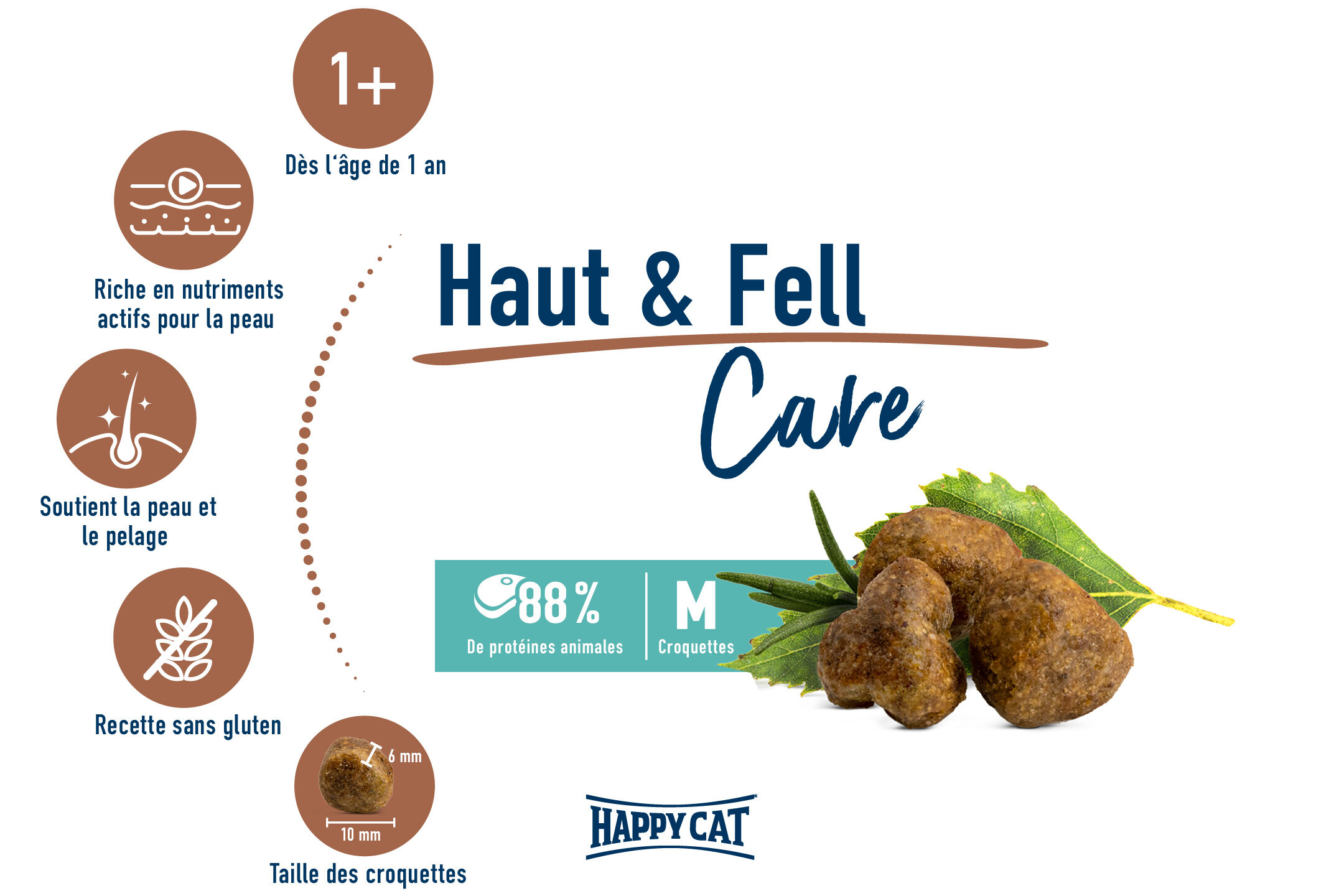 À mesure qu'il avance en âge, à la suite d'une blessure, après une opération ou en cas de surpoids, il se peut que les chats ne soient plus en mesure de se toiletter aussi bien qu'auparavant. Un toilettage régulier est pourtant important pour une peau saine et un pelage brillant. Si un chat ne se toilette pas suffisamment, son pelage devient rapidement gras, terne et même emmêlé. En nourrissant votre chat avec Happy Cat Care Haut & Fell vous renforcez le métabolisme de sa peau, ce qui contribue à améliorer l'état de son pelage. De plus, vous pouvez aider votre chat à prendre soin de son pelage en le brossant régulièrement et en douceur.