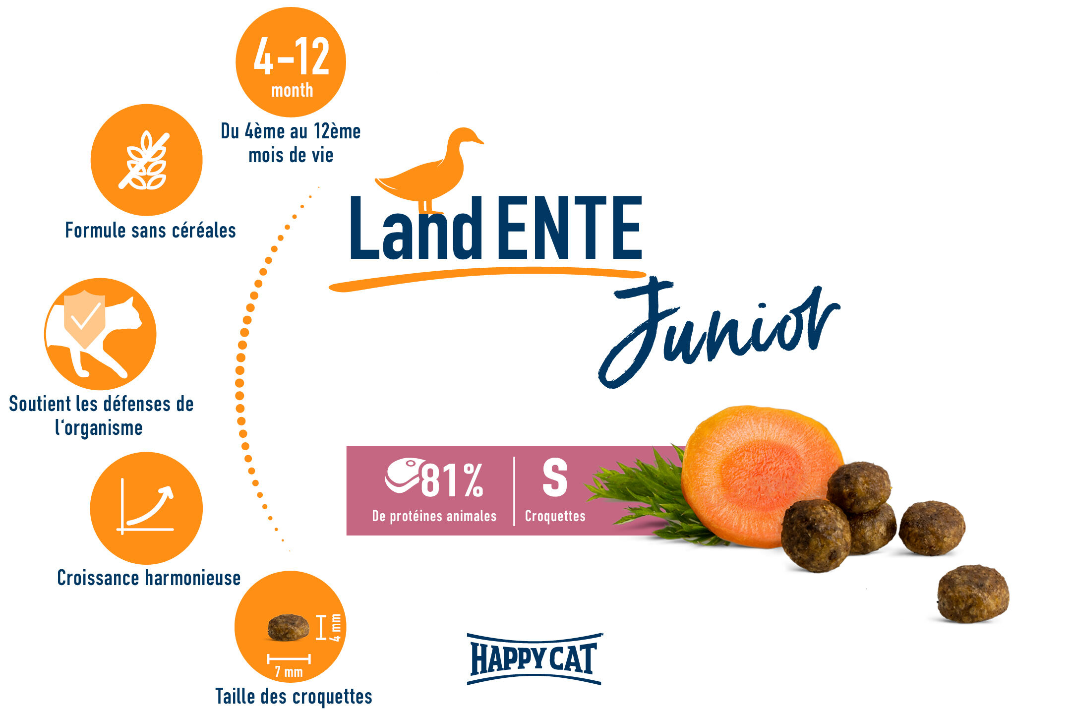 * Selon la préférence du chat (taille des croquettes), il est possible de passer de Happy Cat Junior Canard Fermier à un aliment Happy Cat Adult à 12 mois.