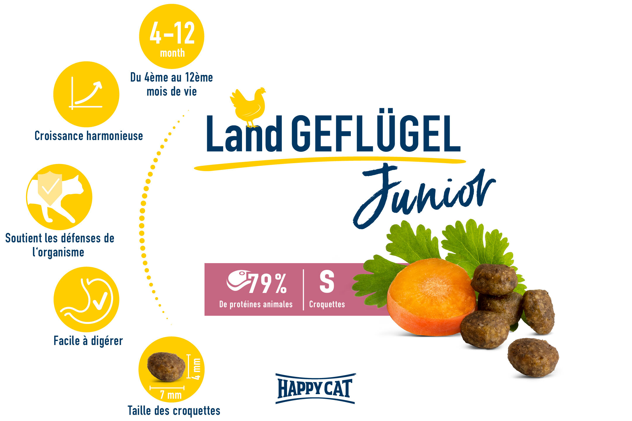 Les aliments Junior peuvent être donnés dès l’âge de 4 mois, car votre chaton se trouve alors dans sa deuxième phase de croissance, au cours de laquelle la prise de poids ralentit. Lors du passage de la nourriture pour chatons à la nourriture pour juniors, il est recommandé de procéder à une transition lente et douce pour ménager le système digestif. Pour cela, vous pouvez mélanger la nourriture pour chatons à la nourriture Junior sur une période de 8 à 10 jours, en augmentant la proportion des nouvelles croquettes Junior progressivement chaque jour. Ainsi, votre chaton sensible pourra s'habituer sans problème à sa nouvelle alimentation. Avec Happy Cat Junior Volaille Fermière, vous répondez aux besoins nutritionnels de votre jeune chat et il bénéficie ainsi de la meilleure base pour une vie de félin longue et pleine de vitalité. Nos croquettes Junior sont toujours de petite taille (environ 4 x 7 mm), mais légèrement plus grandes que les très petites croquettes Kitten (environ 4 x 5 mm) pour chatons. À l'âge de 1 an, vous pourrez passer à une alimentation pour chats adultes.