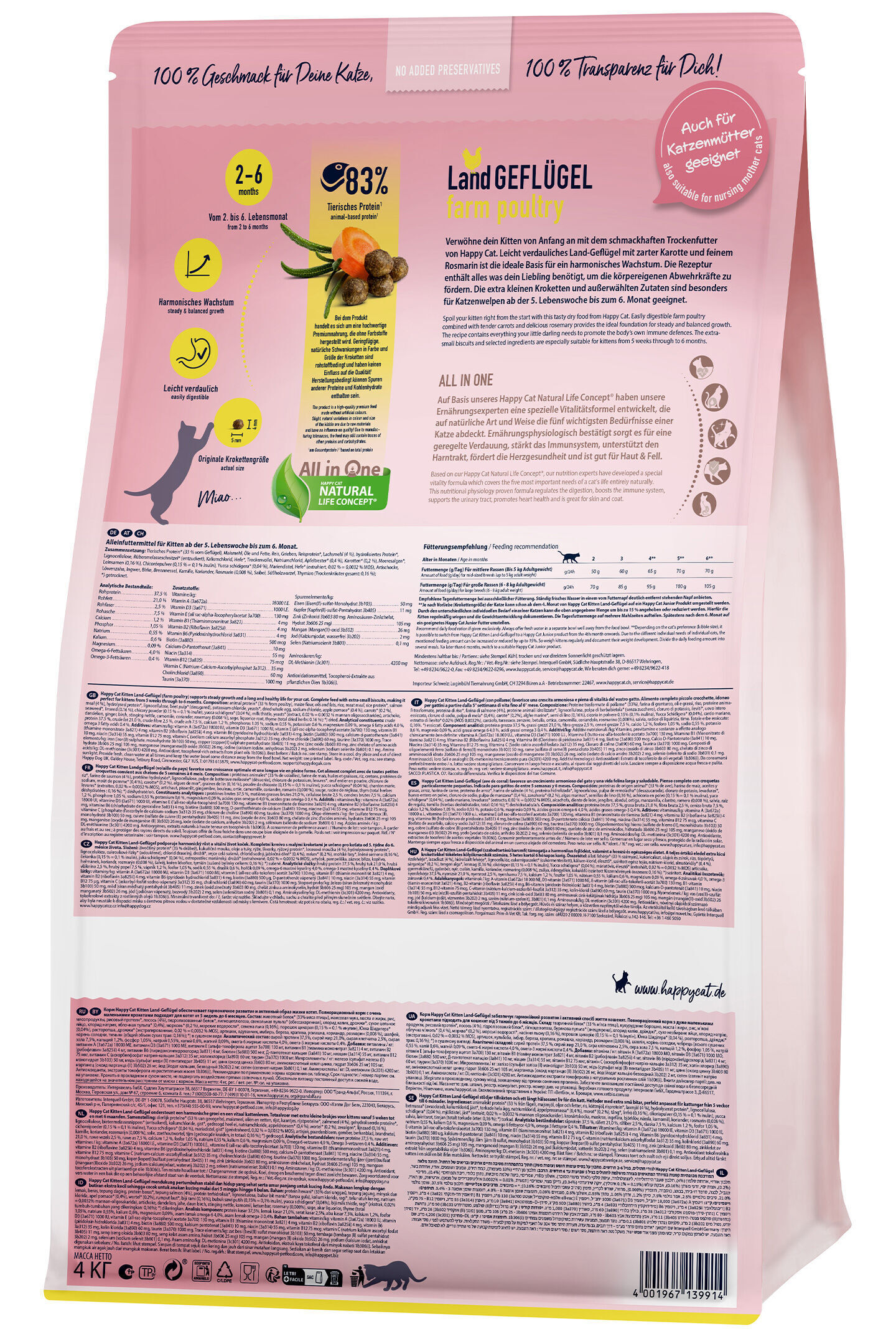 Happy Cat Kitten Volaille Fermière est préparé à partir de volaille facile à digérer, de délicieuses carottes et du romarin. Les protéines de volaille de haute qualité sont nécessaires pour un développement optimal du système musculo-squelettique. L'ajout de vitamine C favorise la stimulation des défenses naturelles de l'organisme. Nos aliments pour chatons contiennent donc tout ce dont votre chaton a besoin pour une croissance harmonieuse. Votre chaton pourra ainsi découvrir le monde avec vitalité !