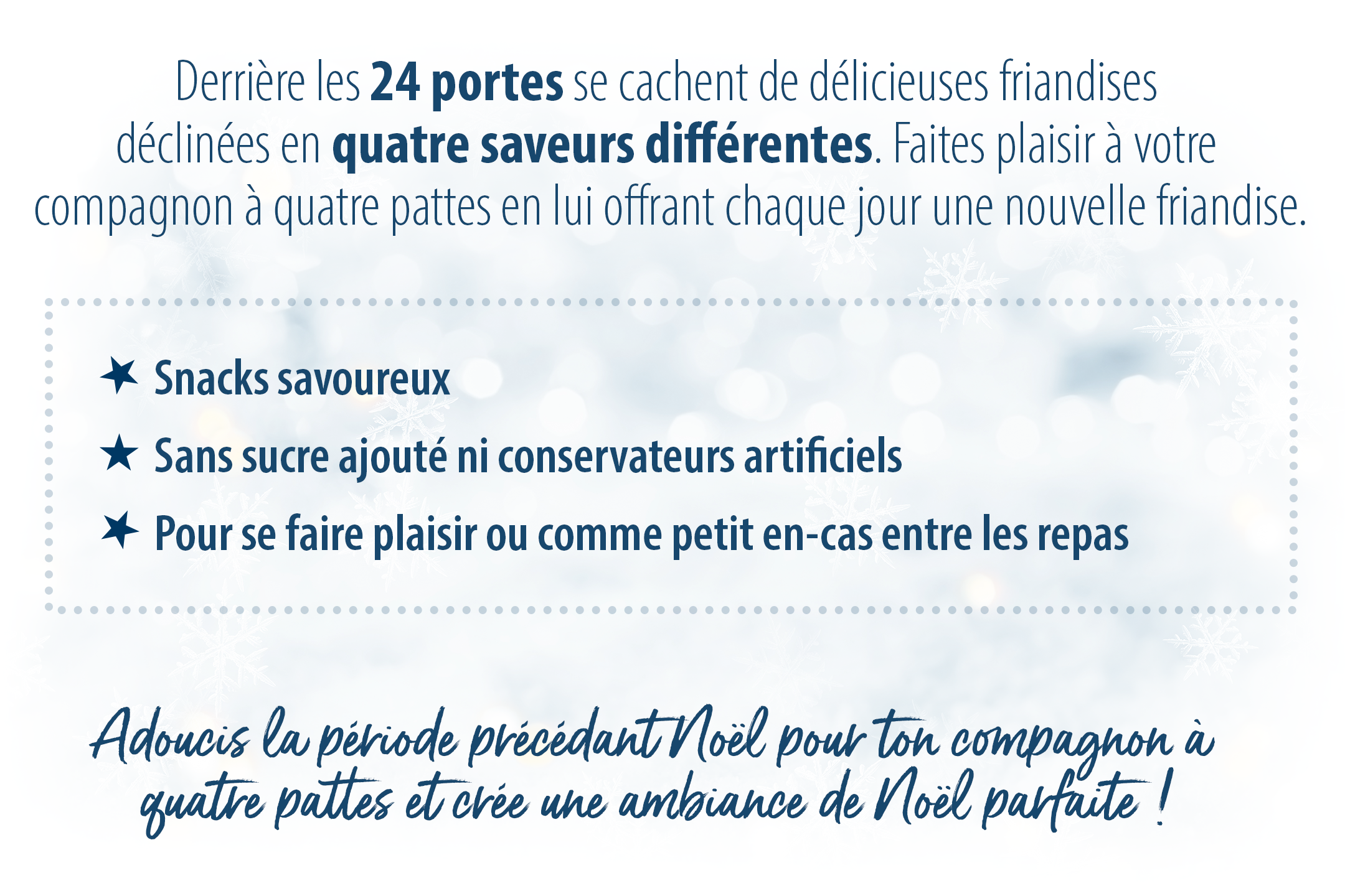 Pendant la période festive qui précède Noël, une autre coutume s'ajoute aux biscuits et au chocolat chaud : le calendrier de l'Avent. Nos chers compagnons à quatre pattes peuvent eux aussi profiter de cette tradition de Noël grâce à notre calendrier de l'Avent Happy Cat. Du 1er au 24 décembre, ils peuvent se réjouir chaque jour d'une délicieuse surprise. Derrière les petites portes se cachent de savoureuses friandises qui conviennent même aux chats sensibles. Jour après jour, votre chat peut se régaler de snacks en forme de cœur, dont la diversité des saveurs garantit une nouvelle expérience gustative jour après jour.